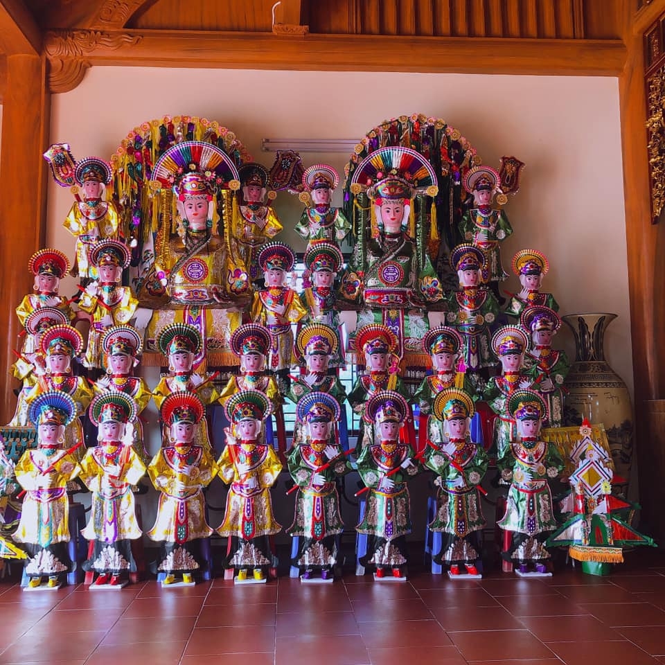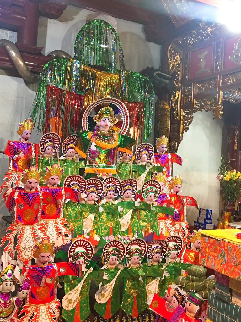 Tranh phủ Ninh Giang - Hải Dương. Dưới năm mũ quan là mũ đương niên, đương cảnh, tùy theo năm đó đương niên hành khiển là ai. Dưới nữa là cỗ mũ rồng của cửu tinh đại diện, cửu cung bát quái, màu sắc của cỗ mũ được làm theo bài vị các sao.