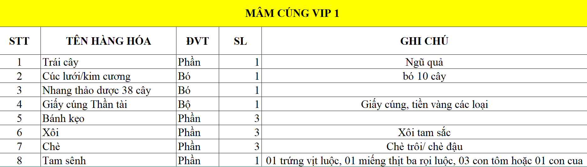 Mâm cúng Thần Tài VIP 1 bao gồm: