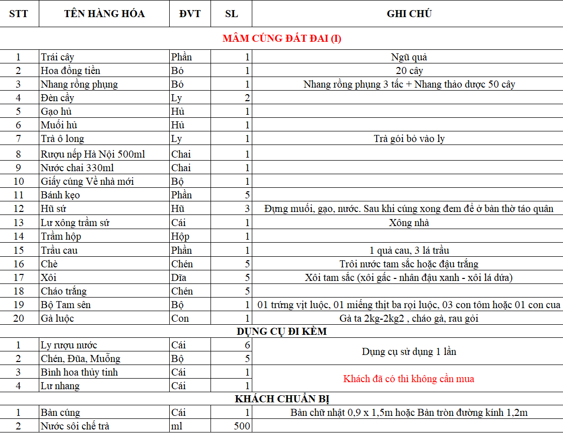 Thông thường khi chuyển về nhà mới, Gia chủ có thờ bàn thờ nào thì sẻ có một mâm cúng cho bàn thờ đó, tùy theo Tâm mà Gia chủ chọn mâm cúng phù hợp. Trong đó Lễ Chính là Mâm cúng tạ đất (Ông Bà Thổ Đất) nhằm cảm ơn và cầu mong về nhà mới được hanh thông thuận lợi.